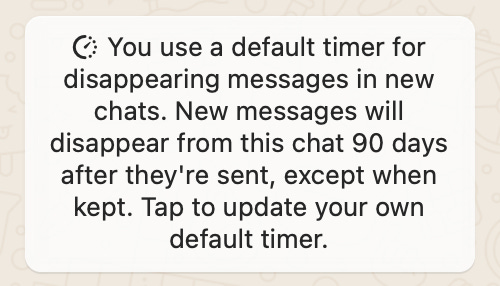 When I met someone last year and we exchanged our first WhatsApp messages, the chat was set to automatically delete after 90 days. I wasn’t aware of this feature; moreover, I hadn’t seen a feature like this used in a messaging app outside of maybe sharing something spicy (🔞) or for sharing sensitive information. In this case, it was set as a default for our whole chat. It was food for thought.